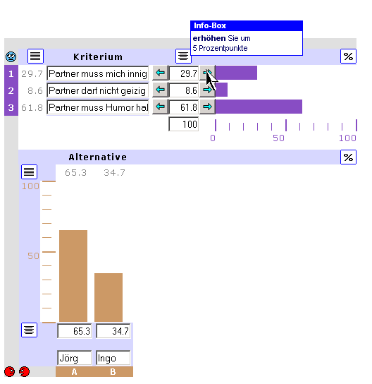 Wenn Sie schrittweise die Prozentwerte (blaue Balken) mit Hilfe der Pfeiltasten links /rechts verändern, können Sie die Auswirkungen auf die Rangfolge Ihrer Alternativen (rote Balken) beobachten